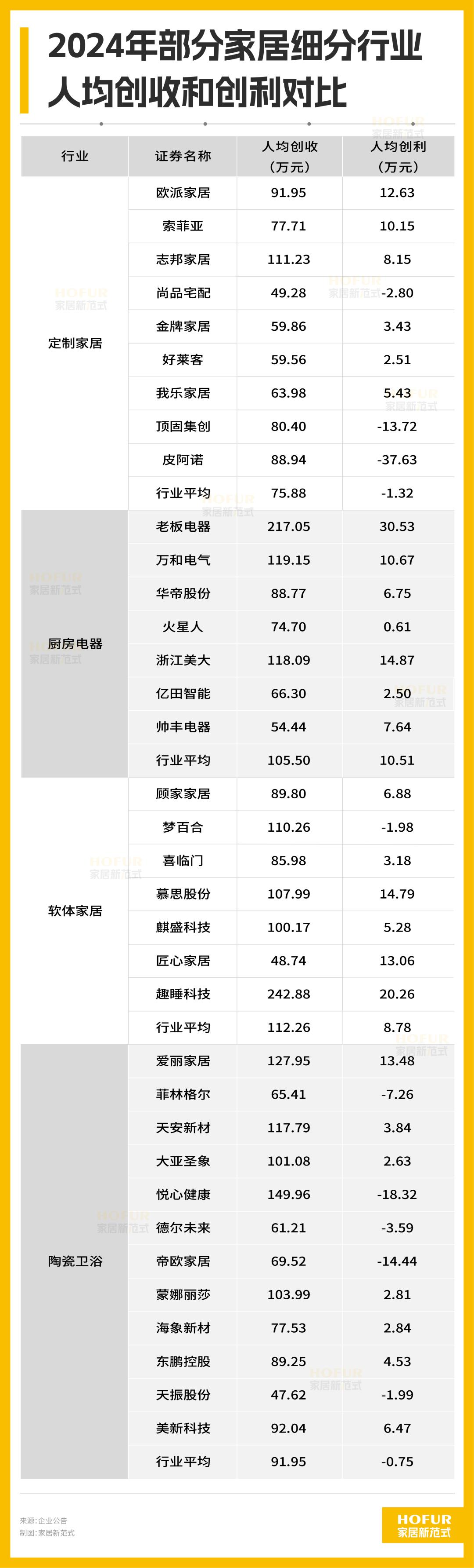从细分行业来看,家居新范式统计发现,2024年厨电行业的人效比较高,人均创利达到10.51万元;软体家居也表现较好,人均创利达到8.78万元;定制家居和陶瓷卫浴的人均创利均负数,表明其运营效率亟待提升。