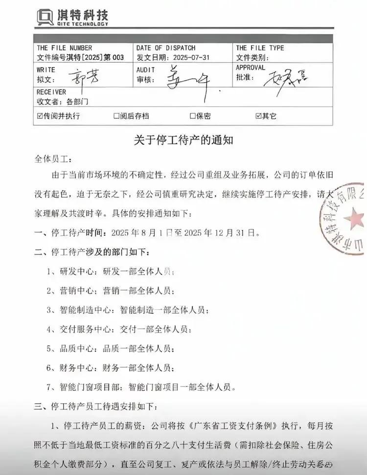 淇特科技通知7月4日至7月31日期间实施营销中心全员放假休息。淇特科技表示,“经济大环境持续走低,房地产市场低迷,我们的订单几乎为零。”原定停工假期结束,淇特科技又将停工时间延长至8月1日至12月31日,且停工范围扩大到研发中心、智能制造中心、交付服务中心等7个部门。据悉,停工期间员工待遇按照广东省最低工资标准的80%发放生活费,扣除社保及公积金后,实发金额仅千元左右。